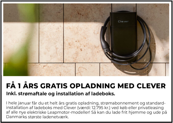 Clever-kampagne i perioden 01.01.-31.01.2026. Forudsætter køb af Clever One og Clever Power-aftale ved køb af en elektrisk Leapmotor personbil hos autoriseret forhandler. Et års Clever One og Clever Power-abonnement med standardinstallation til samlet værdi (privatkøb) kr. 12.795. Modregning: Læs mere på www.clever.dk/modregning. Mindstepris i bindingsperiode (6 mdr.): kr. 0,-.